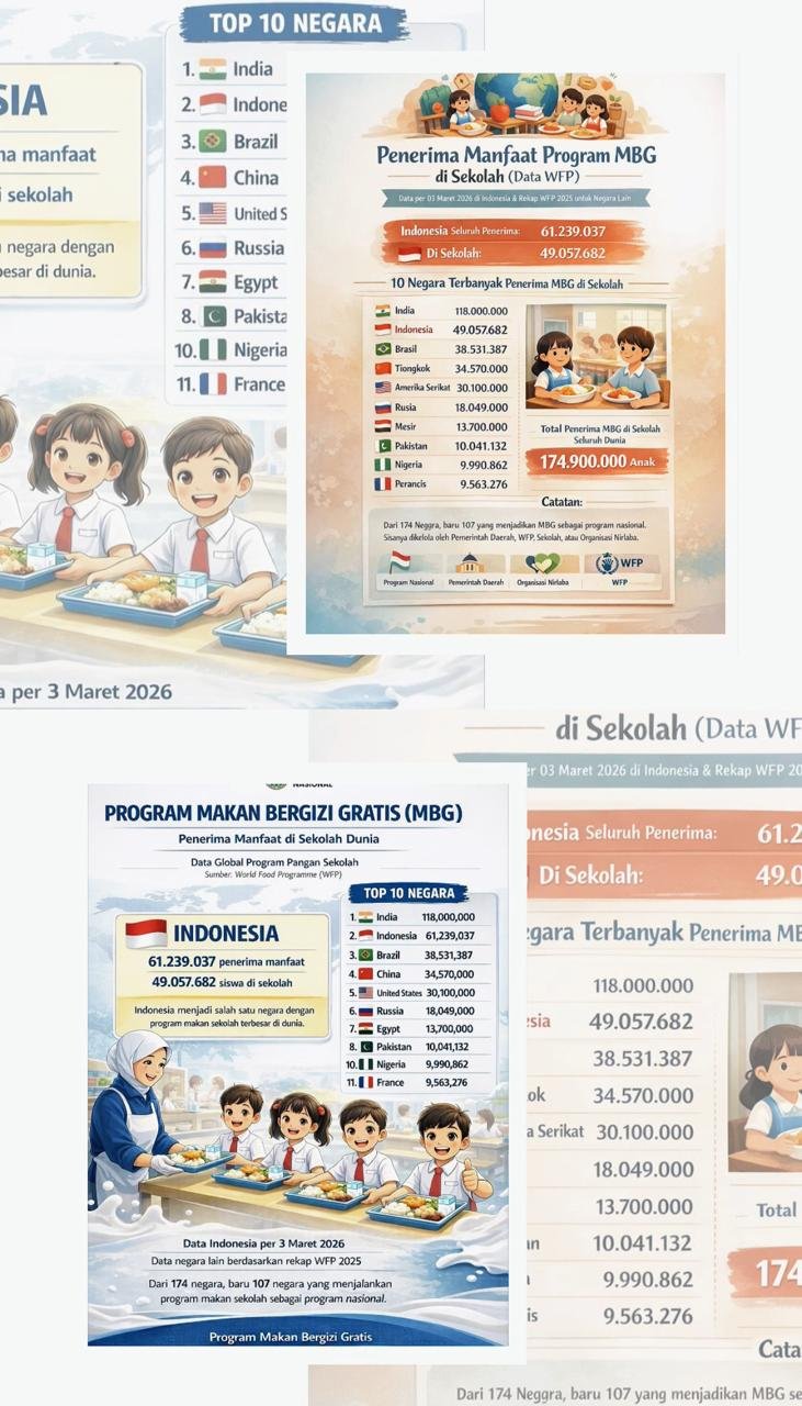 Data global tersebut menunjukkan bahwa dari 174 negara di dunia, baru 107 negara yang menjalankan program makan sekolah sebagai program nasional. Fakta ini menegaskan bahwa Indonesia termasuk dalam kelompok negara yang secara serius menjadikan pemenuhan gizi anak sebagai prioritas pembangunan.